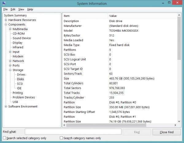 所以一旦我msinfo32运行,在组件- >存储- >磁盘和细节上显示正确的我怎么确定我有一个固态硬盘吗?这些标签:条目、描述制造商,模型中,字节/部门,媒体加载,媒体类型,分区,SCSI总线,SCSI逻辑单元,SCSI端口,SCSI目标ID、行业/跟踪,大小,总圆筒,行业,总总跟踪,跟踪/缸,分区,分区大小、分区的起始偏移量