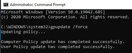 - 现在输入gpupdate /力在命令提示符下执行组策略的变化。
