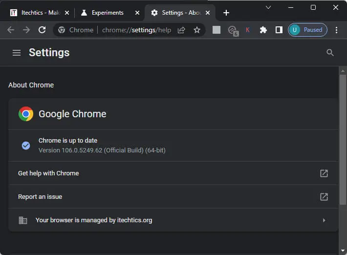 现在将关闭并重新打开浏览器。一旦它,你可以导航到关于谷歌浏览器页面,确认它确实已经被更新到版本106。