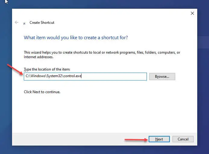 在桌面上右键单击空白,扩大新的,然后选择快捷方式。在创建快捷窗口中,将以下路径控制面板粘贴到文本字段,然后单击下一个: